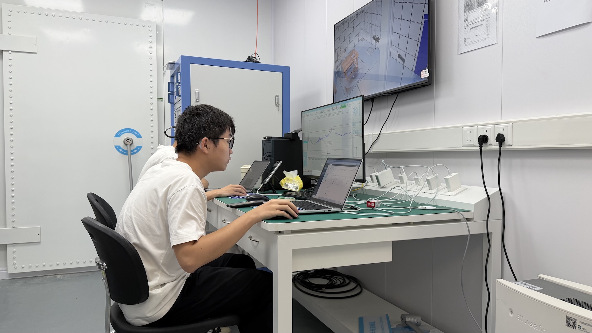 The engineers in Anker’s laboratory also test the products’ EMC (electromagnetic compatibility) to ensure that, for example, a robot vacuum cleaner does not emit magnetic pulses that interfere with the neighbour’s Wi-Fi signal or disrupt the TV picture in the living room. The test room can be seen on the monitor at the top of the picture. (Photo: Peter Gotschalk)