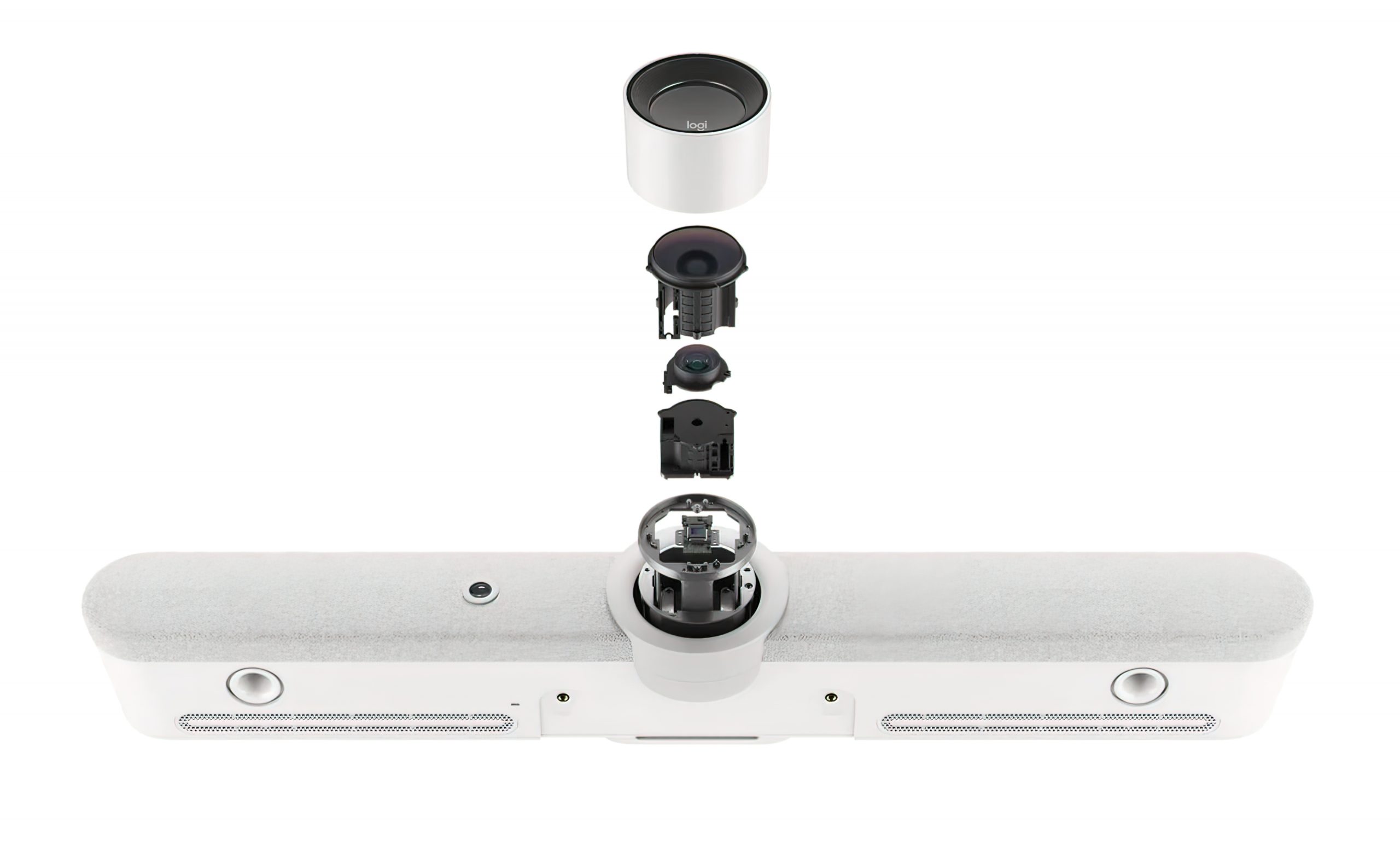 This is where the Logitech Rally Bar comes in. Basically a very advanced soundbar with a camera in the centre, and built-in microphones. It is a complete solution for video conferencing, capturing the entire room with a 4K camera that automatically pans and zooms in and out, depending on how many people are physically participating in the meeting room – and where they are sitting. And with a built-in microphone system that captures the voices in the room and carries them as clearly as possible to those who participate digitally.
