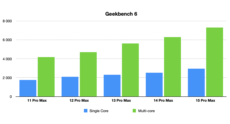 Inside we find the new A17 Pro system on a chip (SoC). It’s built with new 3nm technology and is said to have a twice as fast Neural Engine (for machine learning), which should deliver a total of 10 per cent better performance. The fact that the 15 Pro has more memory should also make everything feel faster. According to the Geekbench performance test, it’s a bit modest. It’s 18 per cent faster with one core and 16 per cent faster with all cores. Not bad!