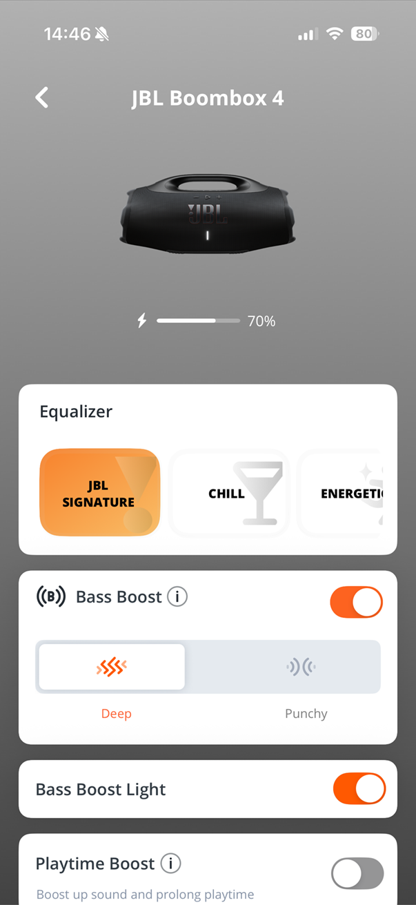 JBL states that the Boombox 4 uses AI Sound Boost to analyse the music you play and adjust and balance the sound to minimise distortion when you turn up the volume. What you could describe it as a kind of intelligent volume control.