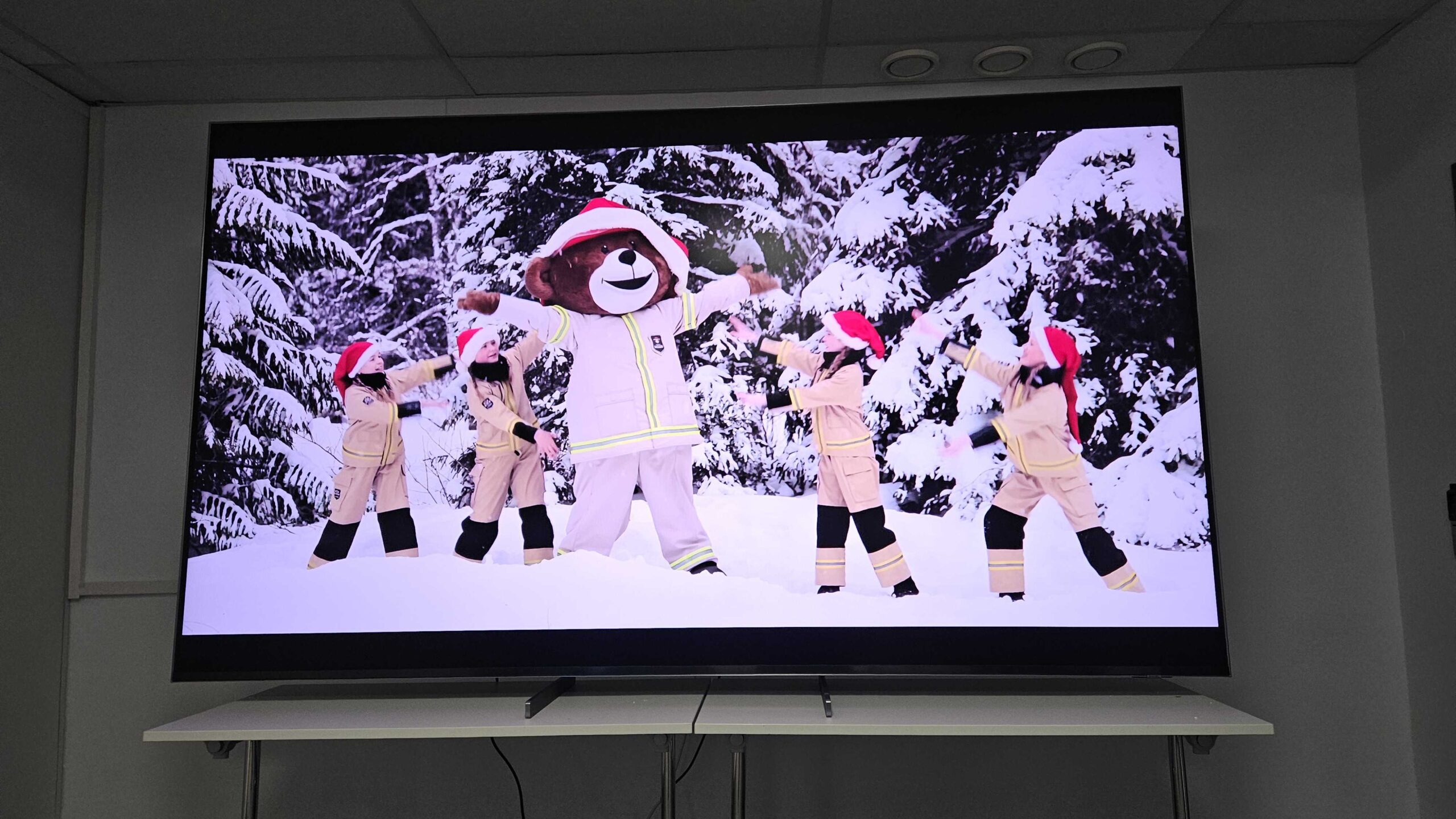 Even a teddy bear in the snow looks quite overwhelming on a 115-inch RGB TV. (Photo: Audun Hage)